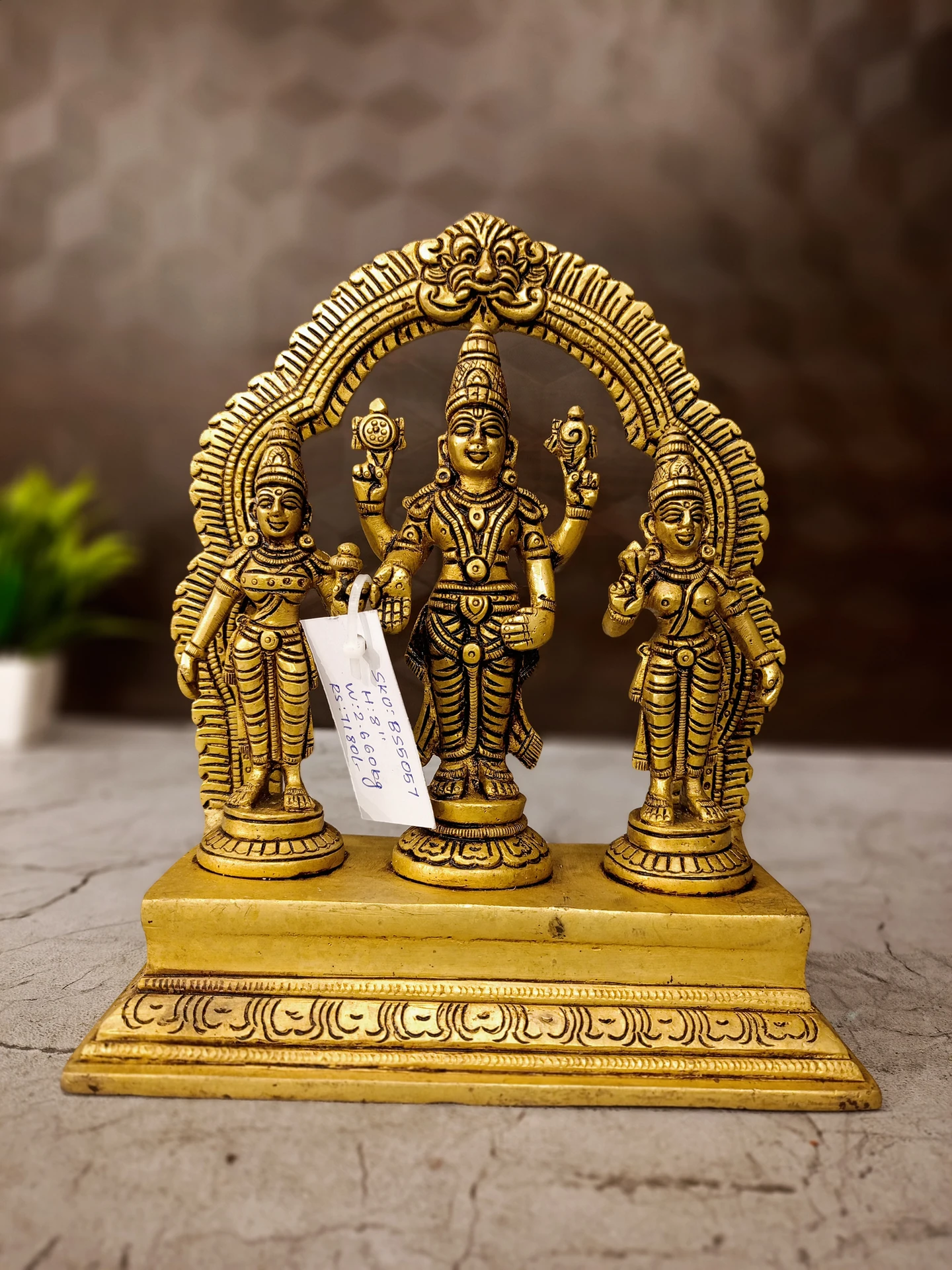 Discover the exquisite beauty of our handcrafted antique Brass Perumal With Sridevi Budevi Idol, exclusively available at VgoCart. This meticulously crafted 8” idol reflects the exemplary artistry and tradition, making it a perfect addition to your home decor. Each piece is created with precision, showcasing intricate details that symbolize the divine grace of Perumal, flanked by Sridevi and Budevi, promising to elevate the spiritual ambiance of your space.