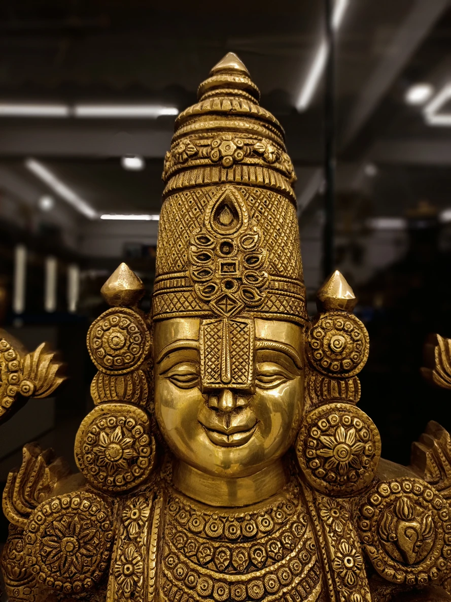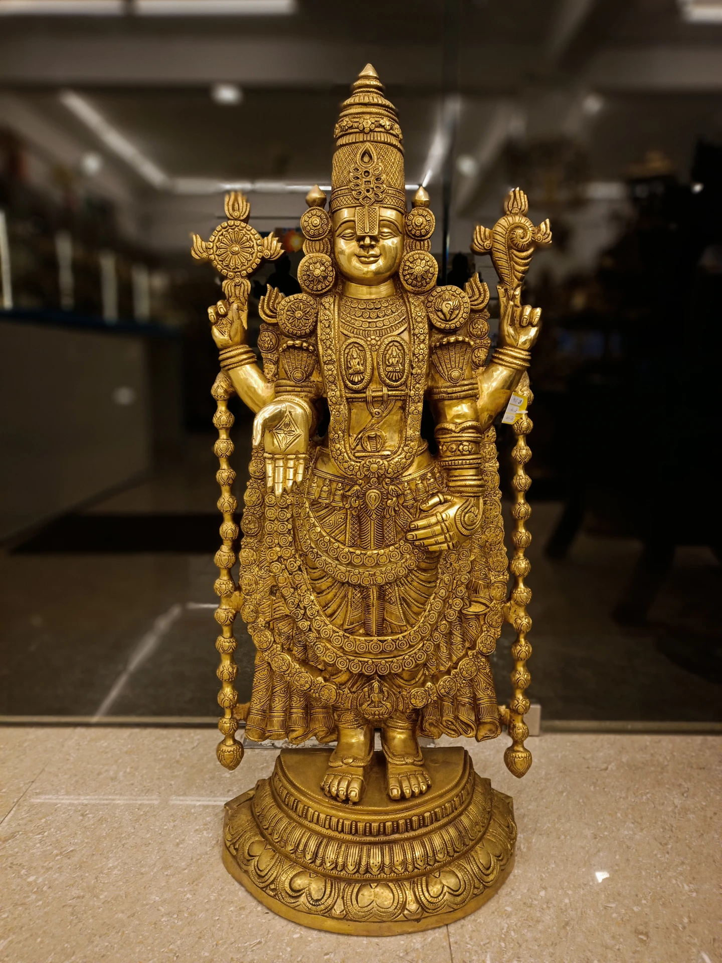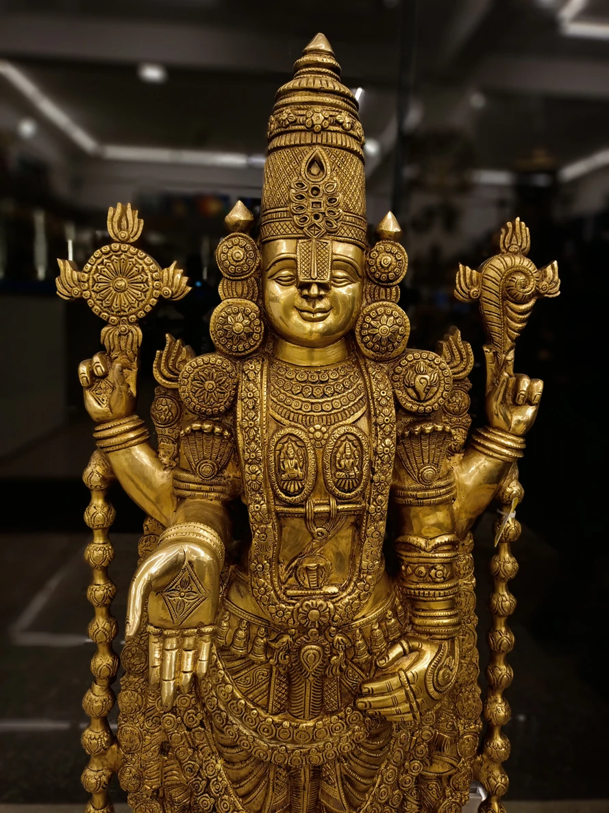 A stunning Lord Venkateswara (popularly known as Lord Balaji or Tirupati Balaji) idol, likely crafted in brass with an antique finish. This specific posture, known as the Sthanaka (standing) pose, is rich with symbolism and is highly regarded in both spiritual practice and interior design.