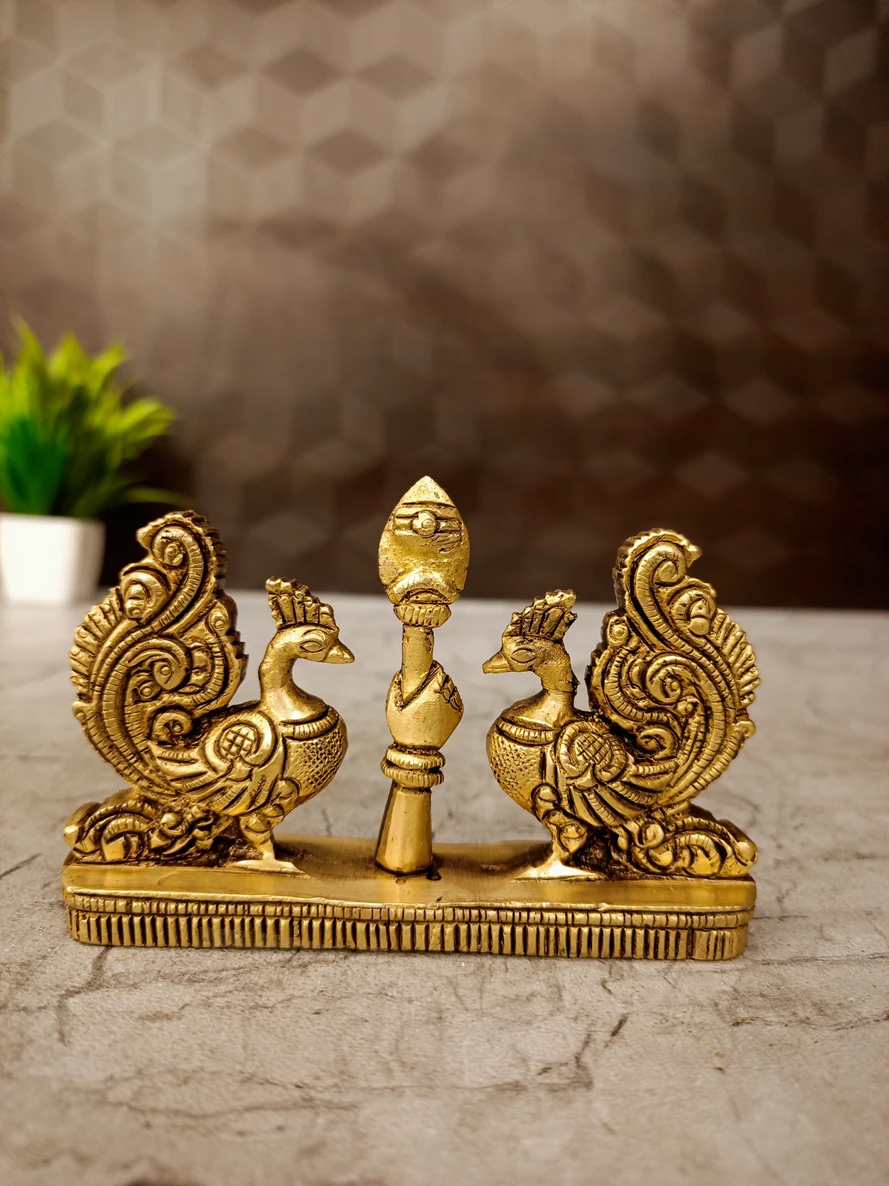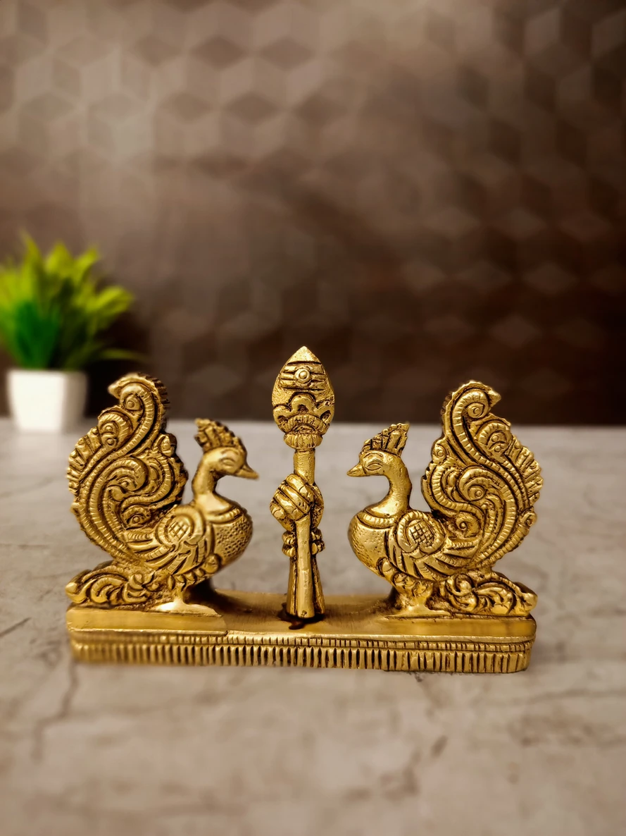 A beautiful brass Vel flanked by two Peacocks, which are deeply significant symbols in Hindu iconography, particularly within Tamil culture and the worship of Lord Murugan.