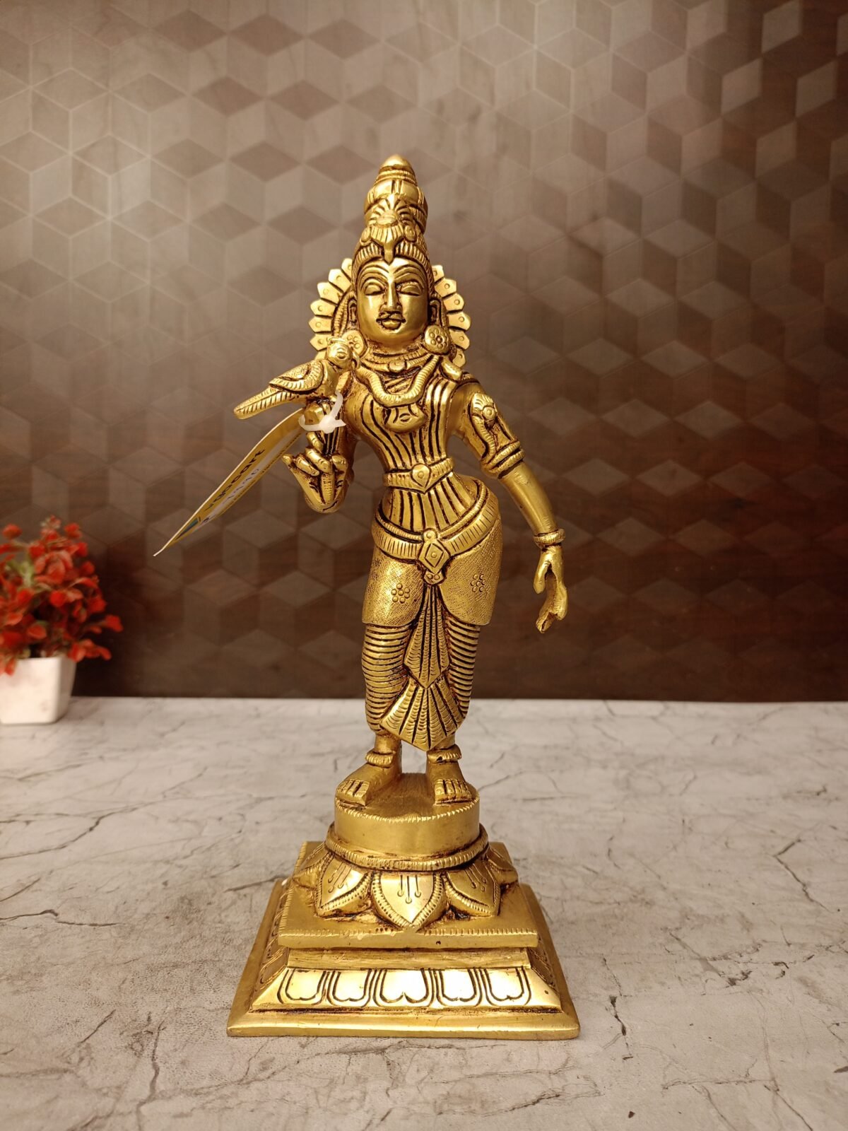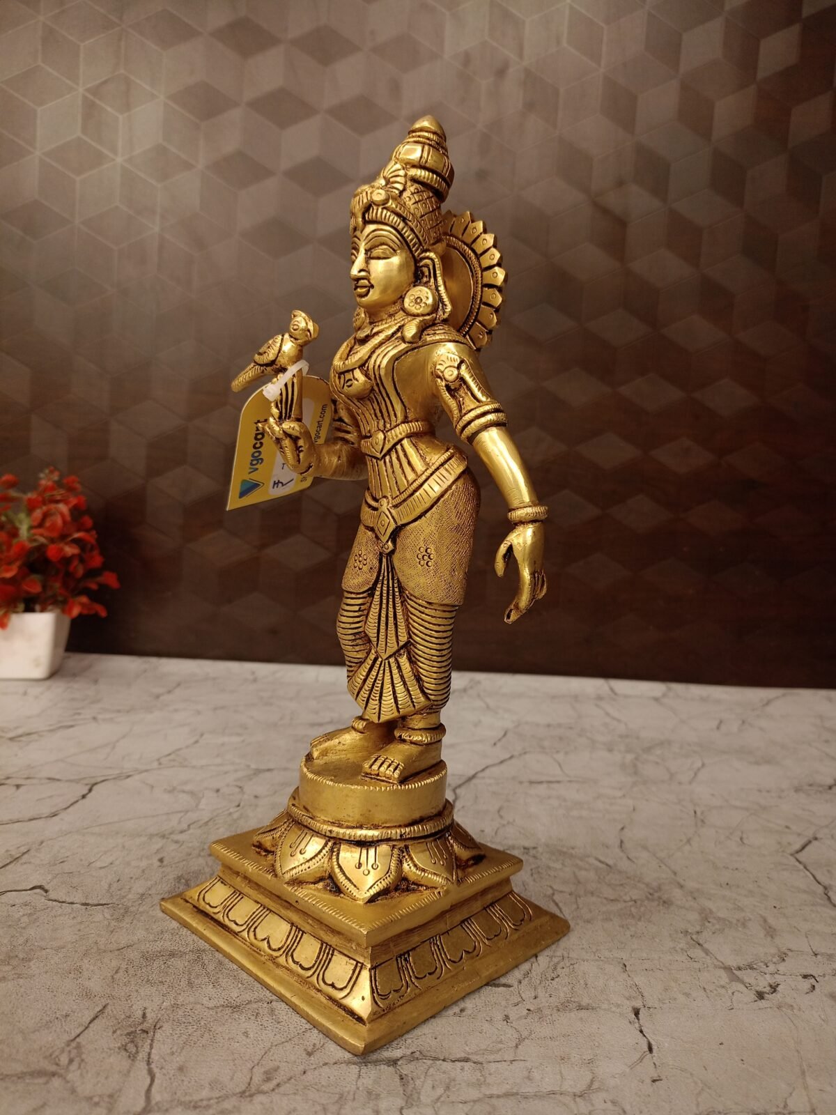 Beyond its artistic value, the Brass Goddess Meenakshi Amman Idol offers numerous benefits when incorporated into your daily worship and living space. It is believed that praying to Goddess Meenakshi can invoke her blessings for peace, prosperity, and a harmonious life. The idol can be placed in both home temples and living areas, where it serves as a focal point for meditation and spiritual connection. Additionally, the timeless brass design enhances the aesthetics of any decor setting, making it a versatile addition that blends tradition with elegance.